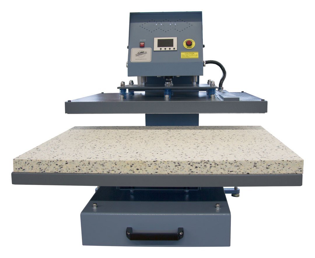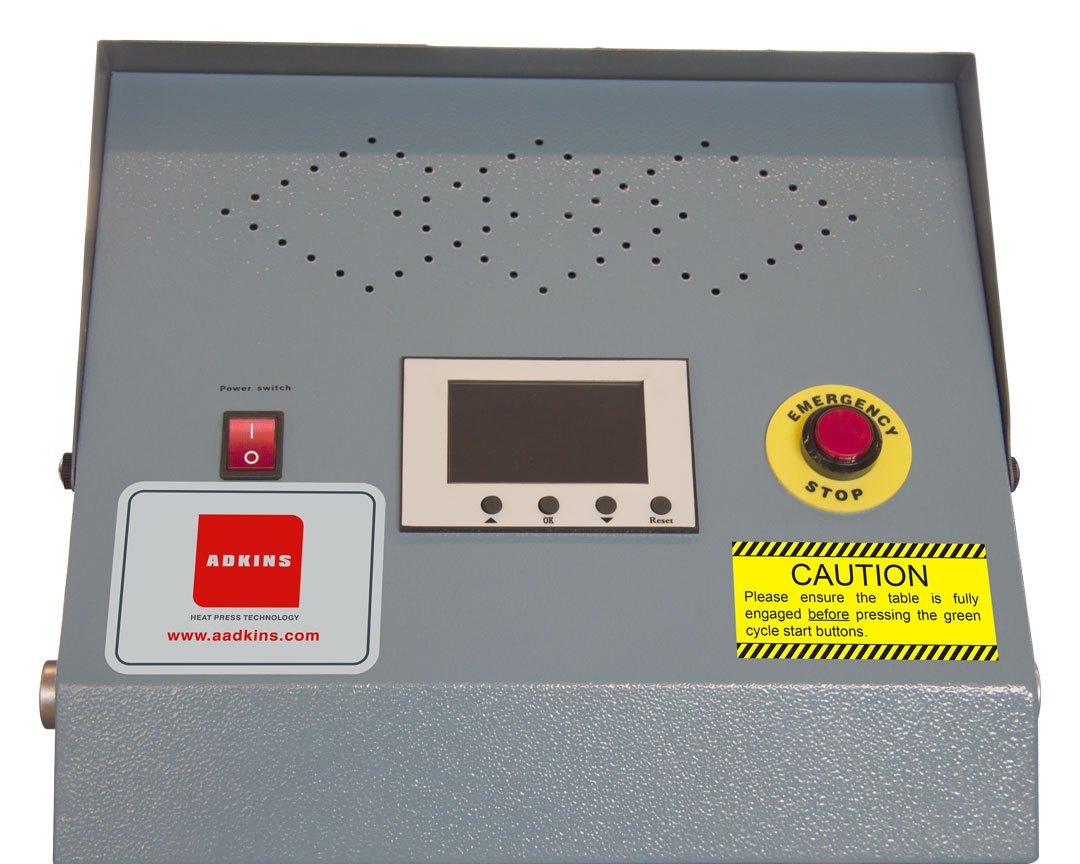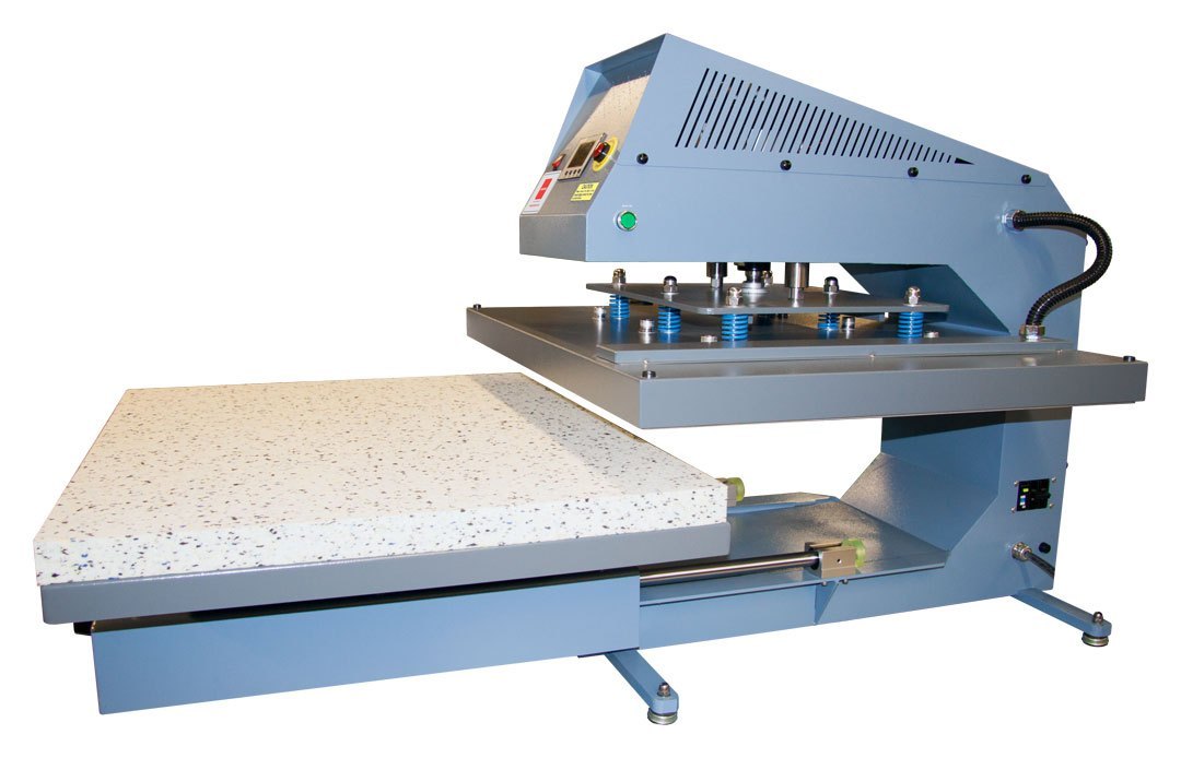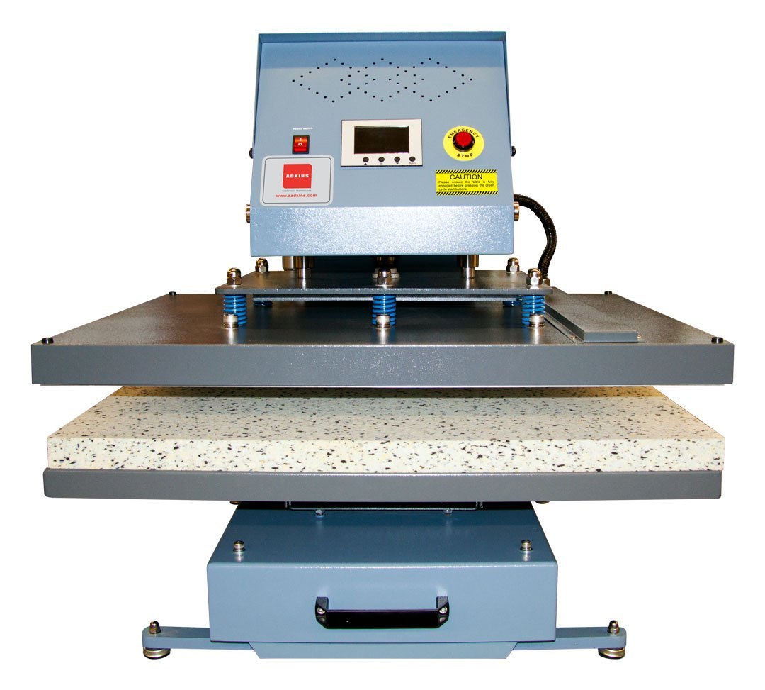 One of Adkins most popular large format presses. The Omega Series 750 Press is a pneumatically operated, single table heat press featuring a large pressing area measuring 80 cm x 100 cm, with a sliding lower table. Perfectly suited for medium to high volume production environments.