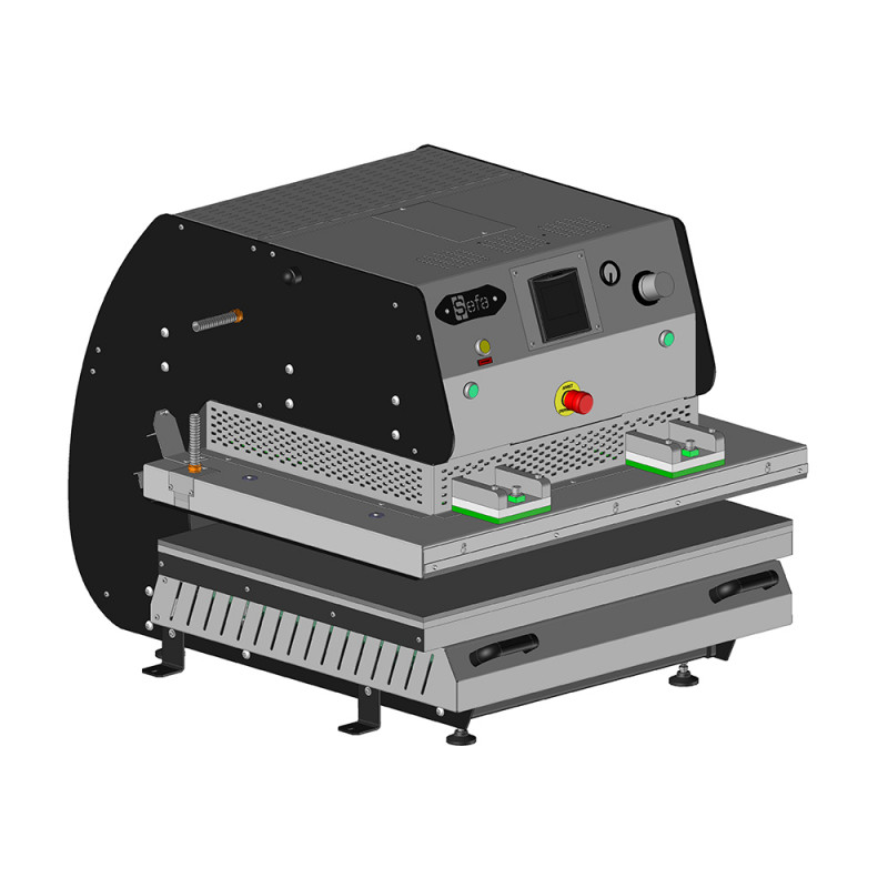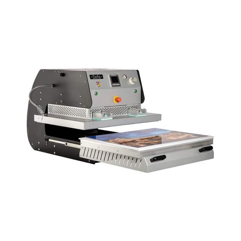 Large format, air-operated, manual-drawer press.