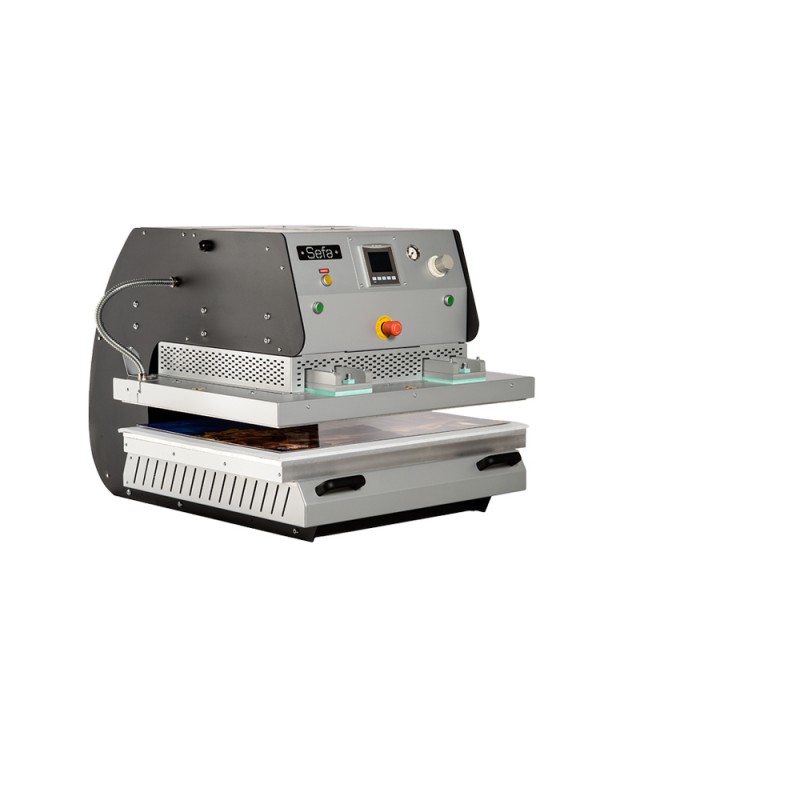 - Double pneumatic cylinders ensure an even pressure across the whole platen